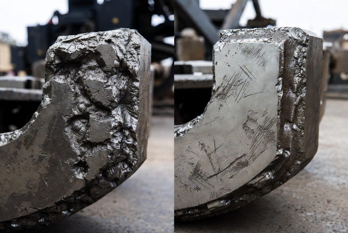 Toughness is the material’s ability to absorb energy during impact loading without fracturing. Austenitic manganese steel is the benchmark for toughness in crusher wear parts — its capacity to absorb repeated high-energy impacts without fracturing is why it dominates jaw crusher and primary cone crusher applications. The trade-off is moderate abrasion resistance relative to high-chrome alloys.